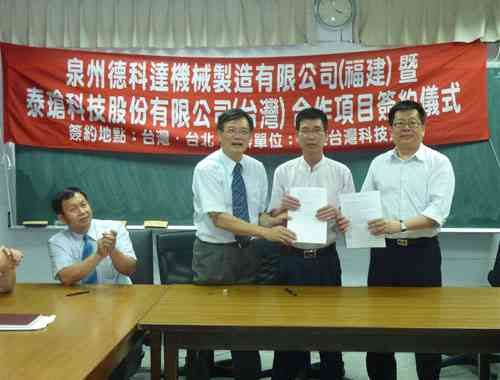 為了進一步提高泉州德柯達機械制造的技術等綜合實力,培養技術型人才,泉州德柯達機械制造有限公司與臺灣科技大學項目簽約商談。圖為洽談現場簽約儀式。